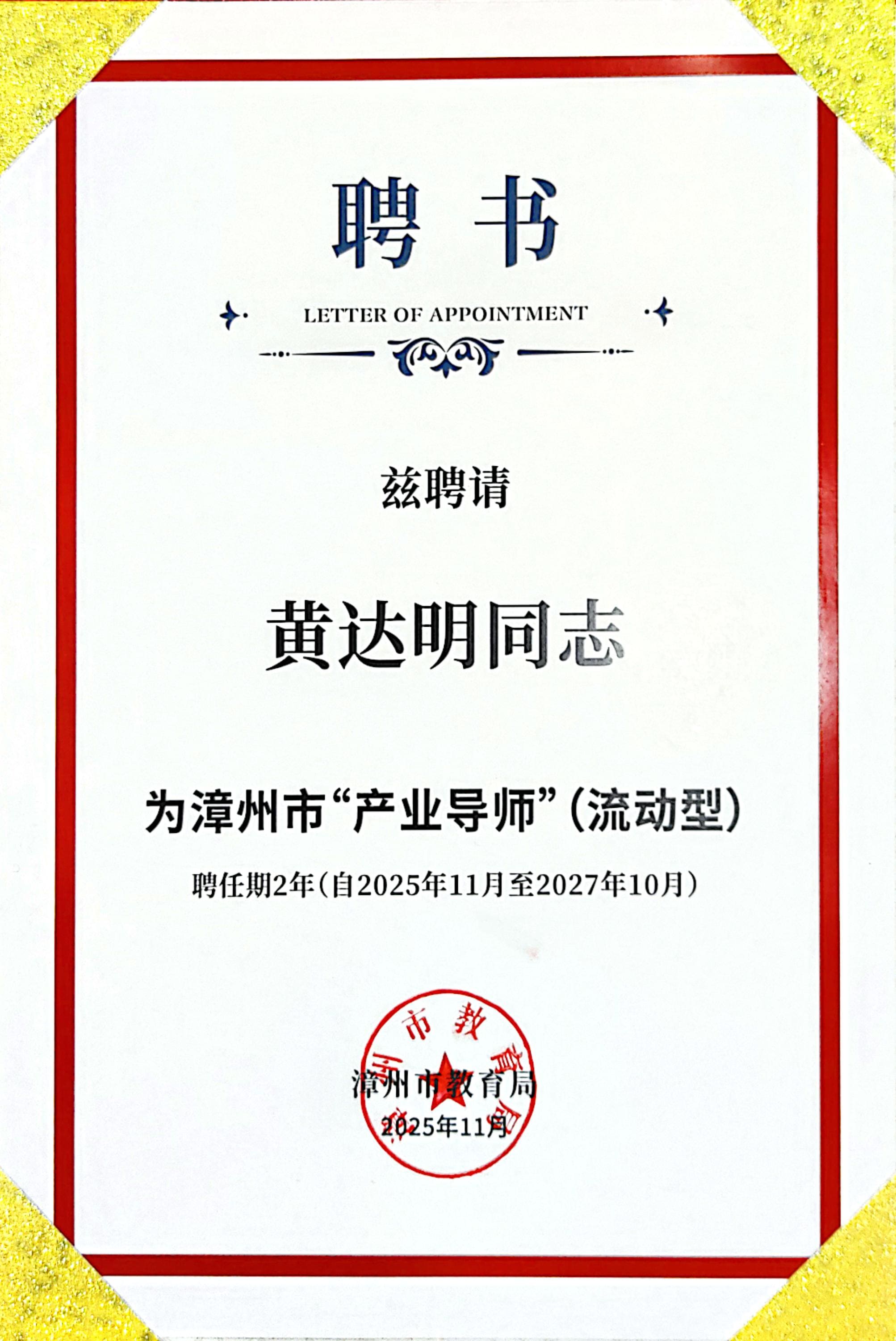漳州市教育局聘请纽什达集团董事长黄达明为漳州职业技术学院产业导师